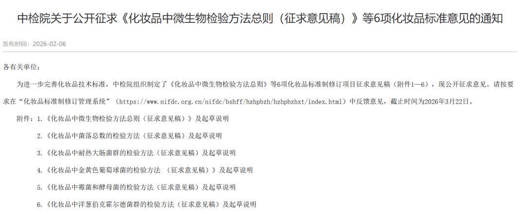 2月6日,中检院发布通知,公开征求《化妆品中微生物检验方法总则(征求意见稿)》等6项化妆品标准意见,进一步完善我国化妆品技术标准体系,强化化妆品卫生安全监管。