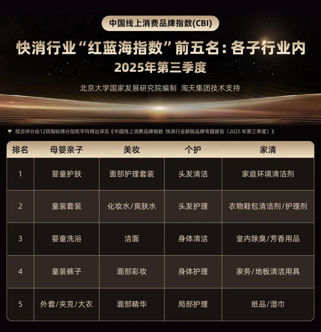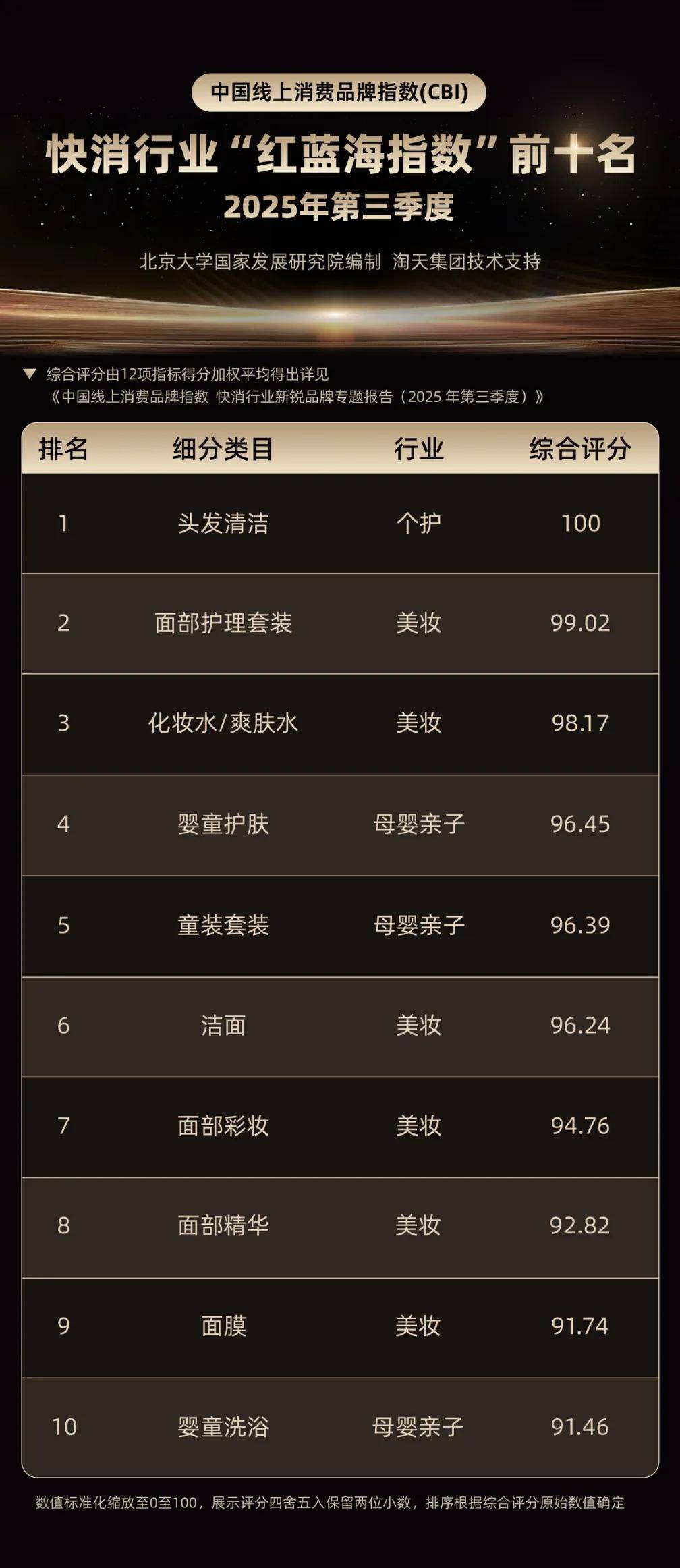 2025年第三季度,头发清洁、面部护理套装、化妆水/爽肤水、婴童护肤、童装套装排在“蓝海”赛道前列。