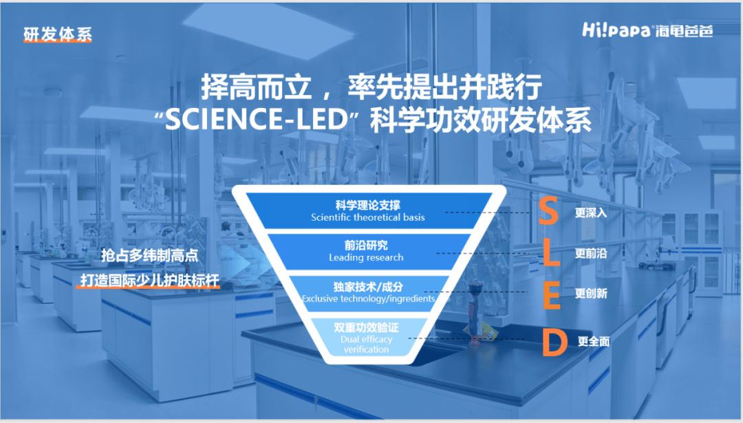 首先,重点剖析了海龟爸爸首创的“SCIENCE-LED”科学功效研发体系,该体系以少儿皮肤生理数据为核心,打破传统“成人配方降级”的粗放模式,建立从基础研究到产品落地的完整链路,并构建“基础研究-功效验证-产品落地”的闭环。