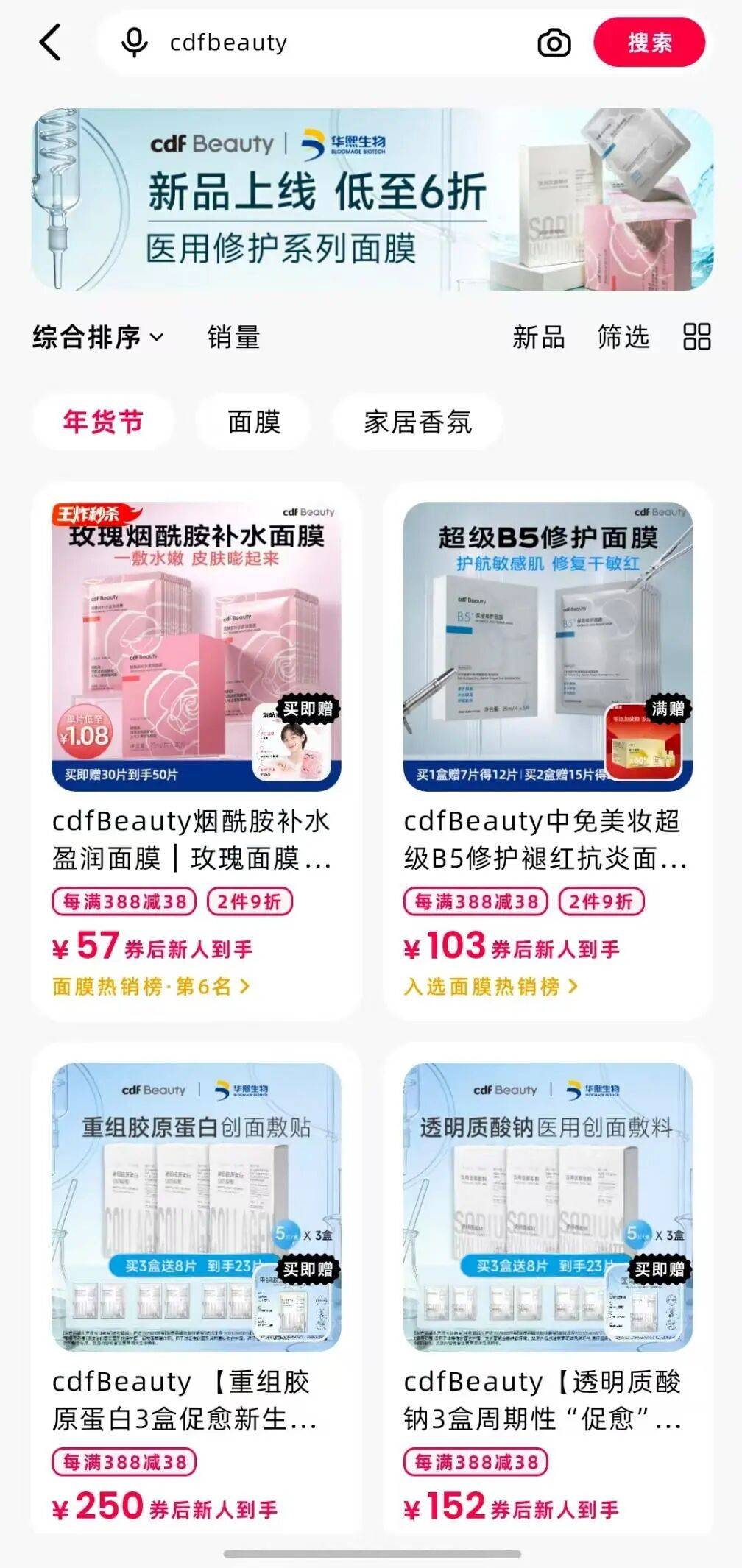 据了解,cdf Beauty推出的六款面膜,涵盖3款妆字号(烟酰胺补水盈润面膜、多糖舒润安肌面膜、B5保湿修护面膜)与3款械字号(透明质酸钠医用面膜、依克多因医用面膜、重组胶原蛋白医用面膜)产品。