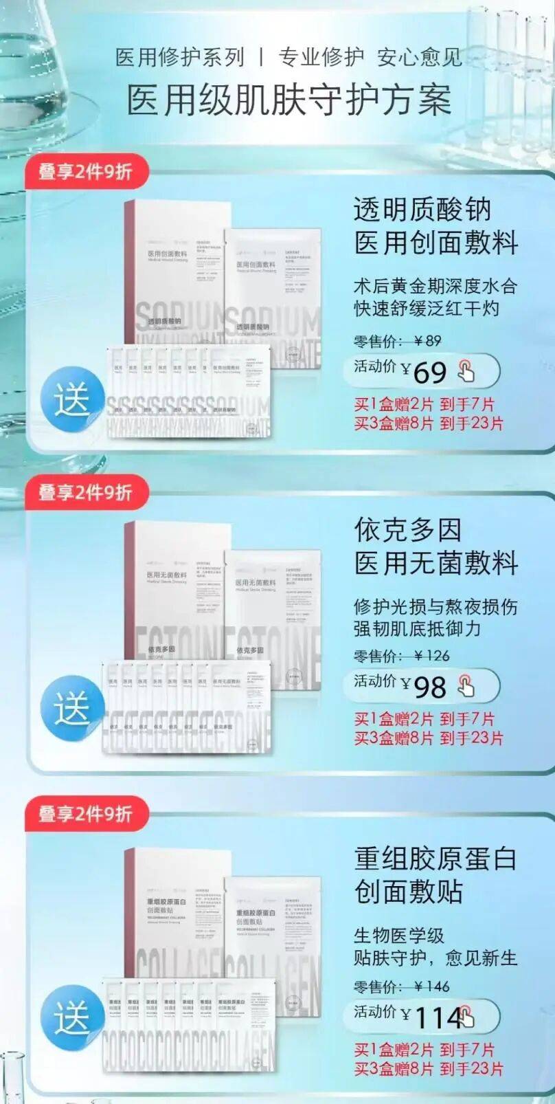 青眼注意到,该品牌的六款面膜产品分别以当前市场热门成分为主推卖点:譬如“妆字号”面膜产品主打烟酰胺、多糖、B5三种功效成分,“械字号”则聚焦透明质酸钠、依克多因、重组胶原蛋白三类医美级原料。